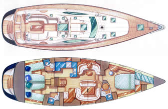 By choosing an "owner's" layout we aim to provide our Club owners with a comfortable cabin featuring a walk-around bed and en-suite facilities. Flexible aft cabins can be used as twins or doubles, also en-suite.