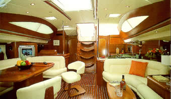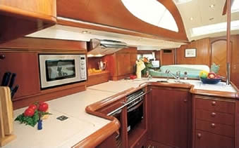 A plush air-conditioned saloon, perfectly equipped for short-medium term cruising, offering 21st century entertainment with DVD player, HiFi with CD player, comfortable dining for 6-8 and casual seating for drinks and socialising.
