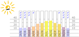 The island has a mediterranean climate with hot and dry summers, and mild and rainy winters. Along the coast the average temperature varies between 19 C and 30 C, while inland it goes down to 13 degrees. Rain is scarce on the coast but constant sea breezes moderate the hottest of the summer heat. The whole of peninsular Italy and the large islands of Sicily and Sardinia have very changeable weather in autumn, winter, and spring in marked contrast to the settled sunny weather of summer. Throughout the winter, however, cloudy rainy days alternate with spells of mild, sunny weather.